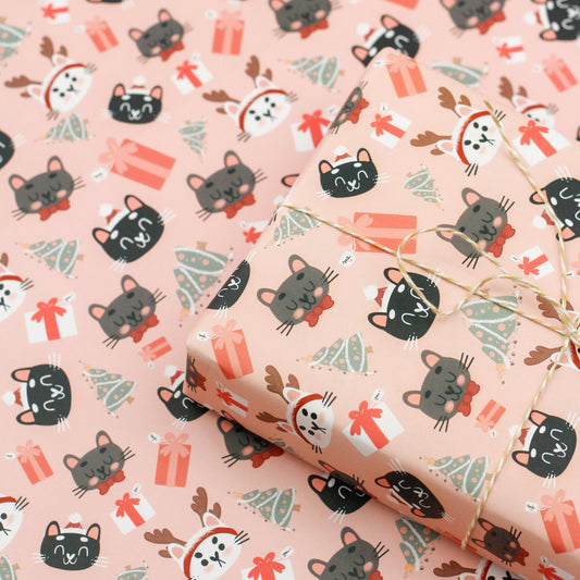 Papier Cadeau Noël chat - Grandes feuilles de papier cadeau - Visages de chat et arbre renversé
